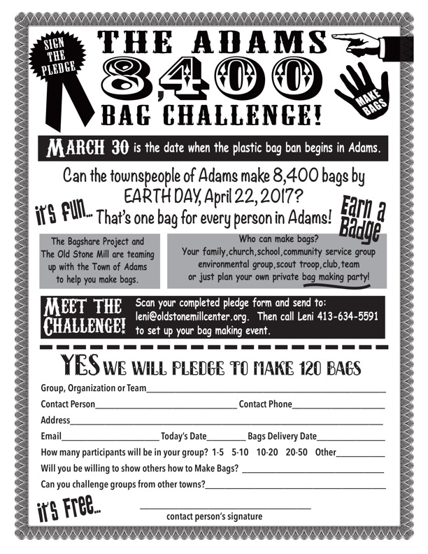 The Pittsfield Chapter of The Bagshare Project is getting ready for the Pittsfield bag ban which goes into effect in 2020. Print out the pledge form below and pledge to make 120 bags to help them meet their 15,000 bag challenge!